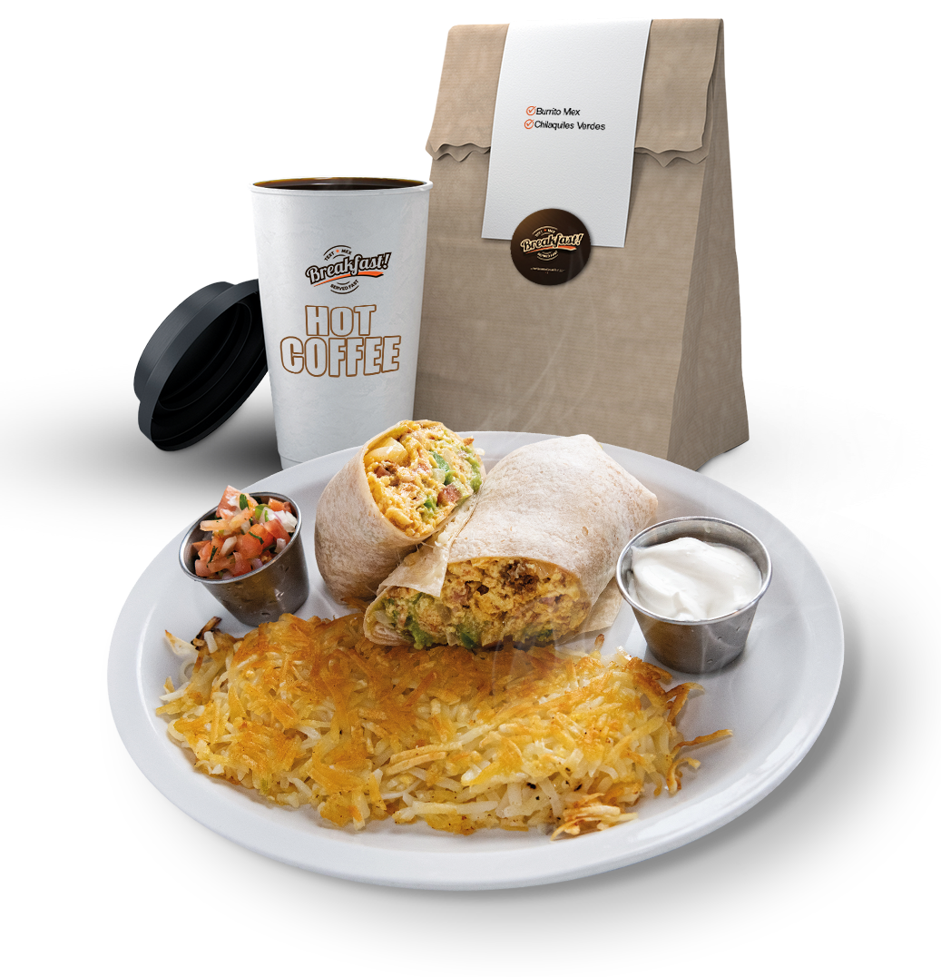 3 scrambled eggs harmoniously mixed with bacon, tomatoes, onions, guacamole, cheddar cheese, and sour cream. Your choice of a side of fresh fruit or golden hash browns. A west coast-inspired breakfast that's bursting with freshness and flavor.